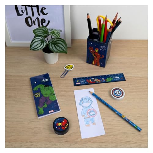 Avengers themed padded desk set. This beautiful filled desk stationary is colored dark blue, with beautiful images of the Avengers heroes. Contents: pencil, 2D eraser, ruler, sharpener, notepad (14.5 by 6 cm), large paper clip with 2D topper.Size: 23 by14 by 6.5 cm.Suitable for children from 3 years old.