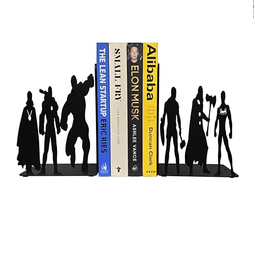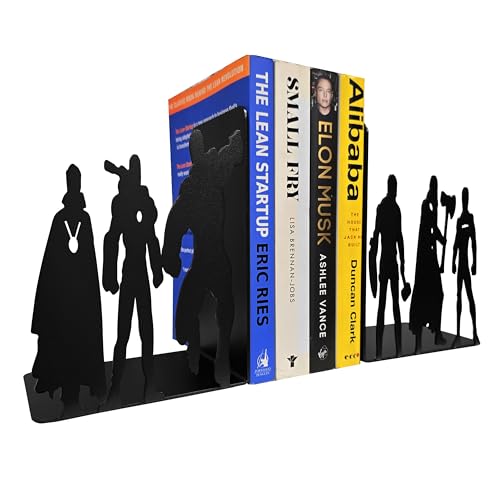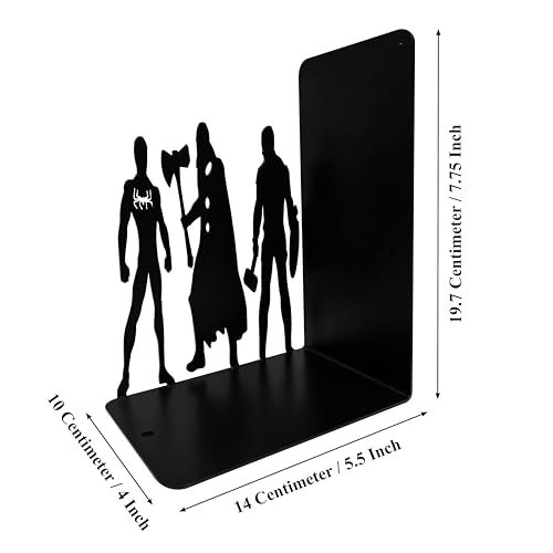 Superhero Metal Bookends, 8 inch Height, 11 inch Width, 4 inch Depth, Black Powder Coated, 3 lbs, Decorative Bookends for Shelves