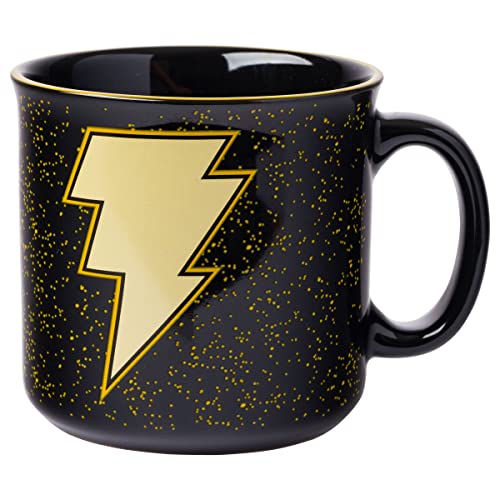 CAMPER MUG: Enjoy your coffee or tea in this awesome DC Comics Black Adam 20oz. Ceramic Camper Mug. Featuring “Black Adam” on one side and a cool lightning bolt on the other side against a black background and a yellow rim